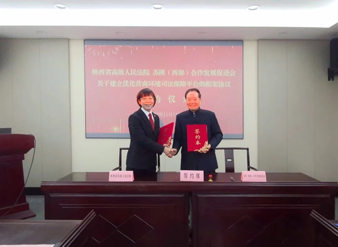 11月7日上午,陜西省高級人民法院與蘇陜(西部)合作發展促進會舉行座談暨關于建立優化營商環境司法保障平臺簽約儀式活動。省高院黨組成員、副院長焦玉珍,省高院民事審判第二庭庭長李曉峰一行5人出席會議。促進會黨委書記、主席劉浩春,執行主席王占林,創會主席崔向陽、周其群、朱振清等企業家代表和有關同志10人出席會議。